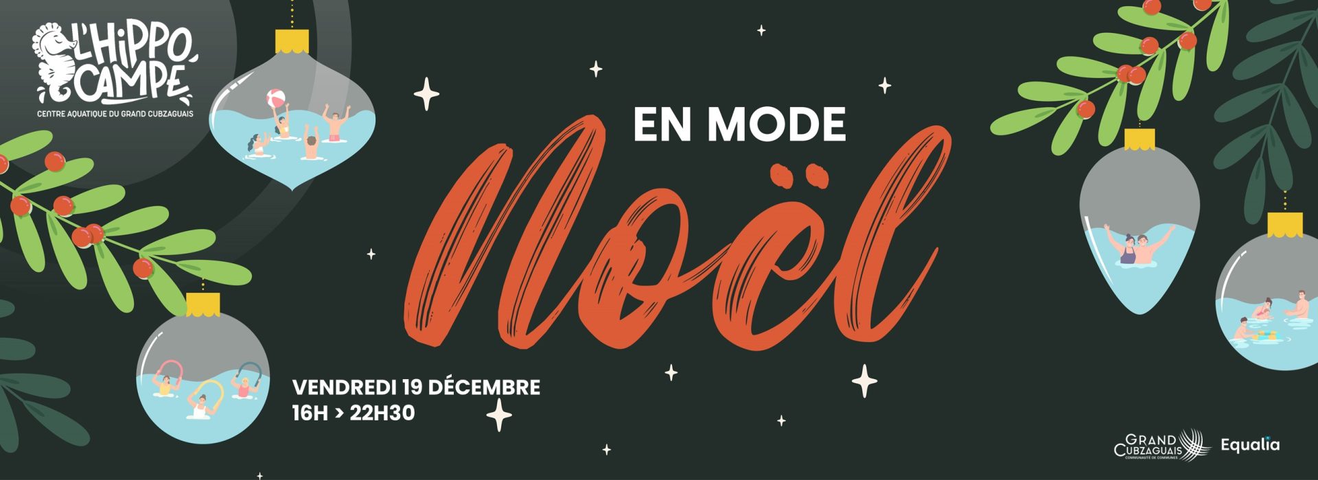 La nocturne du 19 Décembre sera une soirée en mode Noël ! Durant cet événement, 2 animations seront mises en place : un AquaNoël pour toute la famille, suivi d'un Blind Test spécial fin d'année !! En plus, des jeux seront de sortie aux bassins, le chocolat sera distribué de tout les côtés, et un personnage très spécial a aussi promis de venir rien que pour nous...